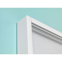 Muurvitrine met whiteboard van Smit Visual gemaakt van wit gelakte aluminium profielen en witte kunststof hoekstukken.