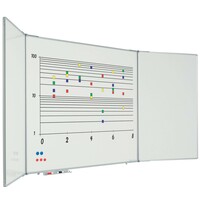 Vijfvlaks wit emailstalen dubbelzijdig whiteboard, inklapbaar. Afmeting: 120 x 200 cm.